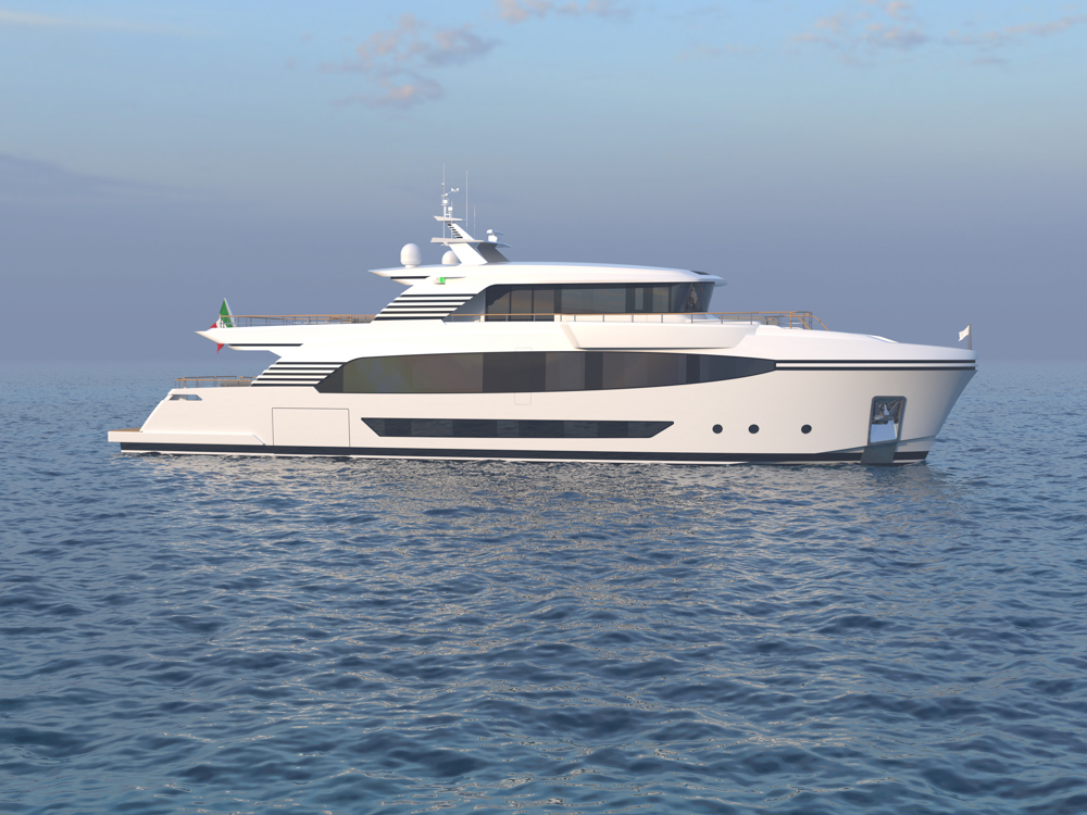 I primi rendering del Concept 32.8 m confermano che tutti gli obiettivi sono stati centrati e, al contempo, mostrano un design da subito riconducibile allo stile di Tommaso Spadolini: linee pulite ed essenziali, con gli elementi vetrati dei tre ponti ad alleggerire il profilo della barca. Quest’ultimo si caratterizza anche per il contenuto slancio di prua, una scelta dettata dal rispetto della lunghezza massima e dalla volontà di avere comunque una linea più classica. “Un’altra richiesta dell’armatore” prosegue Spadolini, “era di avere una barca veloce; per questo abbiamo scelto la lega leggera come materiale di costruzione. Inoltre la motorizzazione è stata affidata a quattro Volvo Penta IPS 1350 per quasi 3 mila cv complessivi. In base ai nostri calcoli il Concept 32.8 sarà in grado di raggiungere circa i 26 nodi di velocità di punta, con una velocità di crociera attorno ai 20 nodi per un’autonomia, a 10 nodi, di 3.500 miglia. L’adozione del Volvo Penta IPS ha imposto uno studio specifico della carena, curato dall’ingegnere Umberto Tagliavini, con una distribuzione dei pesi che prevede lo spostamento verso prua di alcuni serbatoi per bilanciare i quattro motori a poppa. In compenso, questa trasmissione si presta particolarmente a navigare ad andature ridotte, anche questa una precisa esigenza dell’armatore”.