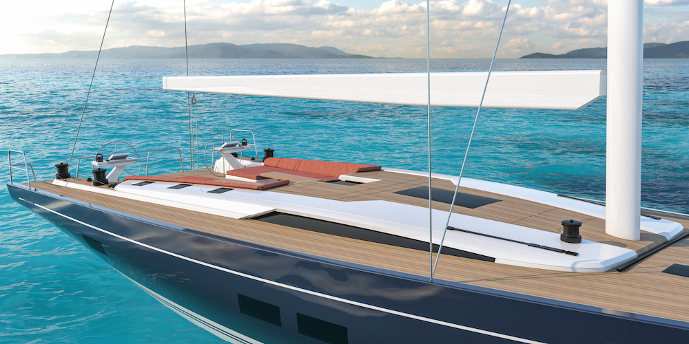 Il piano velico prevede un generoso triangolo di prua e una J accentuata per facilitare il trimming della randa, rendendo la barca più efficiente con venti medio-leggeri e mare corto. L’imbarcazione può essere dotata di trinchetta e strallo, nonché di Code 0 e gennaker. La pala del timone ad alte prestazioni, collocata in posizione molto avanzata, consentirà manovre facili e una guida precisa. La chiglia sarà a T rovesciata con lama weldox e siluro in piombo, ma l’armatore potrà anche optare per una chiglia sollevabile o telescopica. A poppa, un ampio pozzetto ospita due tavoli da caffè e da pranzo utilizzabili separatamente. Queste due aree sono unite da una zona relax con due prendisole.