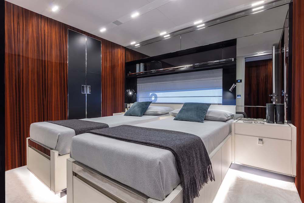 Il layout del ponte inferiore offre all’armatore 4 cabine: la suite armatoriale a tutto baglio a centro barca; una cabina VIP a prua con letto matrimoniale e due armadi; una VIP a sinistra con un armadio e letti sdoppiabili; una cabina doppia con armadio e letti separati. Tutte con bagno indipendente. Il bagno della cabina a dritta funge anche da bagno a giorno.