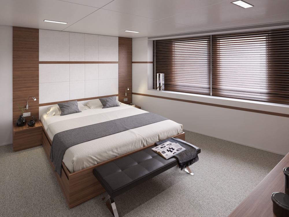 Il ponte inferiore è pensato per ospitare fino a sette cabine equipaggio. Naturalmente, il livello di finitura degli interni può variare in base alle esigenze dell’armatore così come la suddivisione degli ambienti interni e il numero delle cabine ospiti e di quelle per l’equipaggio.