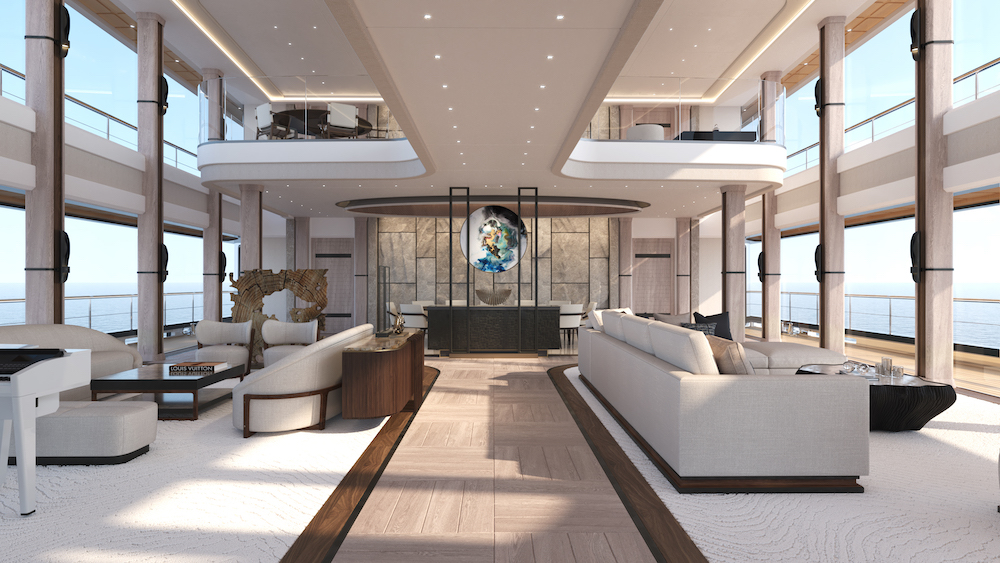 Ma Now offre invece volumi decisamente generosi grazie soprattutto alla sovrastruttura che connette i tre ponti in un susseguirsi di archi e nei due monoliti più alti che sembrano galleggiare sulla sovrastruttura in vetro sottostante. Sul main deck un grande salone a doppia altezza accoglie gli ospiti in un tripudio di luce che entra dalle doppie vetrate. Now può accogliere 18 ospiti in quattro suite Vip posizionate sul main deck, quattro cabine ospiti sul lower deck e una grande suite armatoriale posta nella sezione prodiera del monolite che compone la sovrastruttura. Questo 110 metri dispone inoltre di un teatro da 75 metri quadrati, di un campo da basket, di un’area feste e di grandi terrazze panoramiche. Il quartiere equipaggio può accogliere 41 persone più quattro membri dello staff dell’armatore.