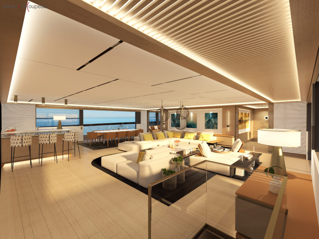 Tra i punti di forza dello yacht, che è articolato su tre ponti più il fly, c’è sicuramente il baglio da 13,10 metri che regala volumi interni generosi e offre la possibilità di disegnare un layout davvero interessante. Sul main deck è infatti prevista la suite armatoriale a tutto baglio che occupa l’intera parte prodiera e gode di una vista a 180 gradi.