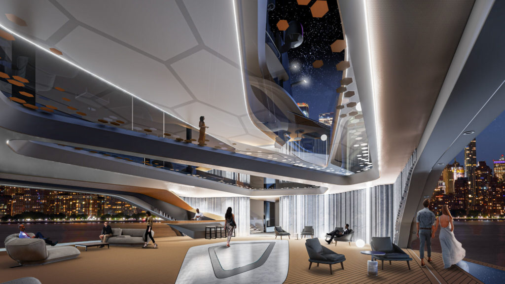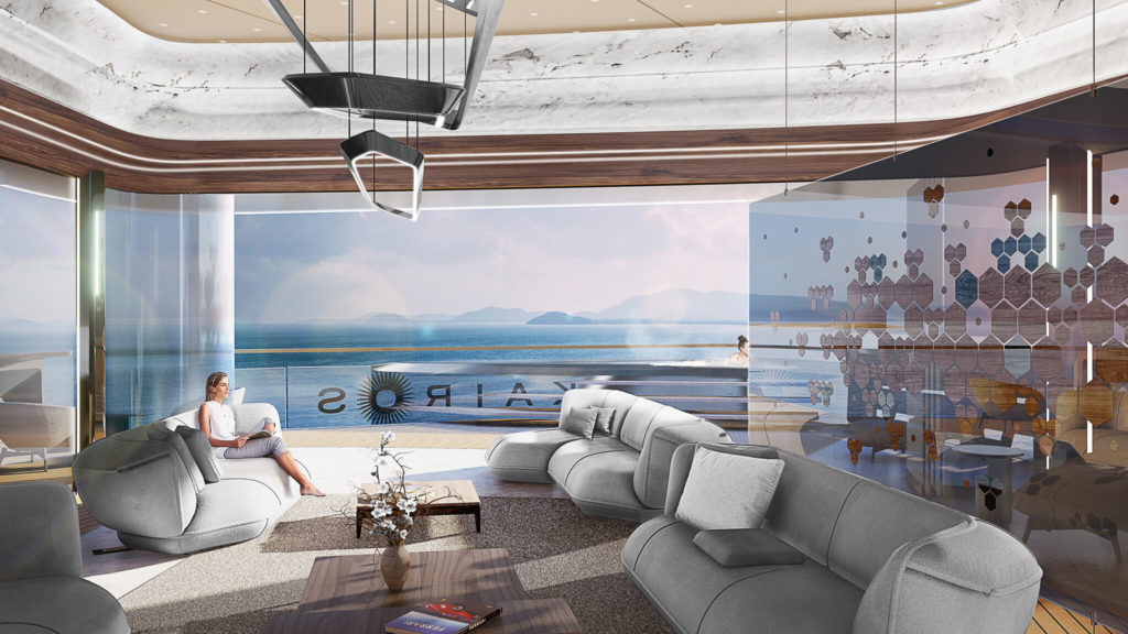 Il layout di KAIROS incoraggia l’interazione sociale, ma allo stesso tempo preserva la magia di momenti intimi in luoghi privati. Ad esempio, sul balcone panoramico a cui si accede sopra il ponte superiore tramite un ascensore, gli ospiti possono godersi un tranquillo momento di rifugio ammirando la vista sul mare.