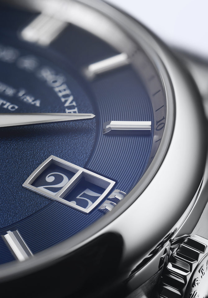 Ma le novità non finiscono qui. A fare notizia è stata la scelta di utilizzare l’acciaio (altra prima assoluta) per realizzare la cassa del diametro di 40,5 mm. L’abilità dei maestri orologiai della Casa sassone è esaltata dalle finiture presenti sul quadrante concepito su più livelli. Linee concentriche incorniciano sia gli indici applicati in oro bianco sia la scala dei piccoli secondi, creando così un piacevole effetto ottico. Sul quadrante gli elementi dominanti sono le due finestrelle che riportano rispettivamente La Grande Data (a destra) e l’indicazione del giorno della settimana sulla sinistra. Le informazioni sono visualizzate all’interno di un display con cifre e lettere bianche su sfondo blu. Ad animare l’Odysseus il calibro di manifattura L155.1 DATOMATIC concepito e sviluppato appositamente per questa referenza. Il movimento a carica automatica è costituito da 99 elementi ed è dotato di una riserva di marcia di 50 ore. Grazie al fondello in vetro zaffiro è possibile apprezzare la meccanica e la lavorazione delle singole componenti. A completare le dotazioni di questo segnatempo, il bracciale in acciaio dotato di fibbia di sicurezza déployant. Non ultimo l’impermeabilità. Come ogni orologio sportivo che si rispetti anche l’Odysseus è stato testato per resistere fino a 120 metri di profondità.