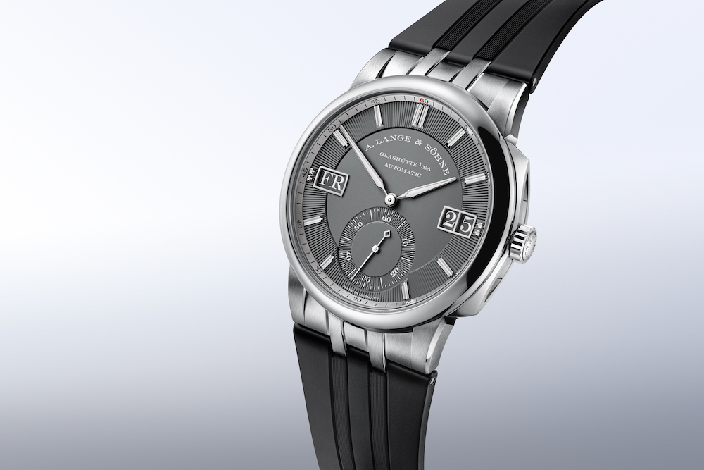 L’altra grande novità è rappresentata dalla tonalità grigio ardesia che caratterizza il quadrante composto da diversi livelli e superfici che gli conferiscono un effetto tridimensionale. Per il resto l’architettura del segnatempo rimane immutata e dal punto di vista estetico c’è da sottolineare l’elegante contrasto generato da questa tonalità abbinata alle lancette in oro bianco e alle indicazioni della Grande Data e dei giorni della settimana sempre di colore bianco. Un’armonia cromatica sulla quale si coglie una nota di colore rosso rappresentata dal numero 60 collocato, a ore 12, all’interno dell’anello rehaut.