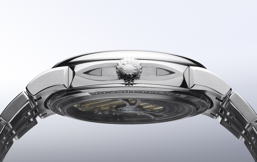 Come per il primo Odysseus anche questa seconda versione vanta il nuovo calibro di manifattura L155.1 DATOMATIC la cui complessità e raffinatezza meccanica può essere apprezzata attraverso il fondello in vetro zaffiro. Una finestra dalla quale si possono cogliere alcuni dettagli come la platina in alpacca naturale decorata con la levigatura a nastro di Glashütte; oppure il ponte del bilanciere sul quale spicca l’incisione con motivo a onde e il castone d’oro avvitato sopra la ruota di scappamento. I pulsanti a forma di cuneo per la correzione della data e del giorno della settimana, posizionati ai lati della corona, conferiscono alla cassa in oro bianco suddivisa in tre parti, la sua caratteristica forma. Un gioco di superfici opache e bordi lucidi caratterizza la finitura della cassa e le anse del cinturino. È possibile scegliere tra cinturini integrati in pelle cucita a mano o in caucciù nero. Quest’ultimo offre un alto grado di comfort grazie ai canali d’aria interni.