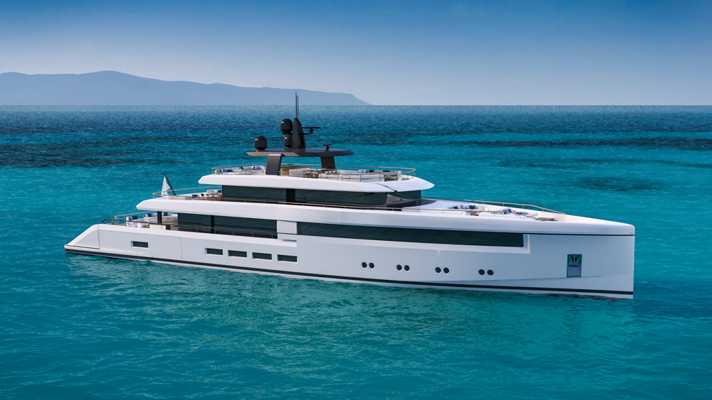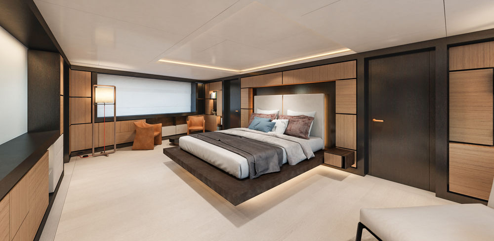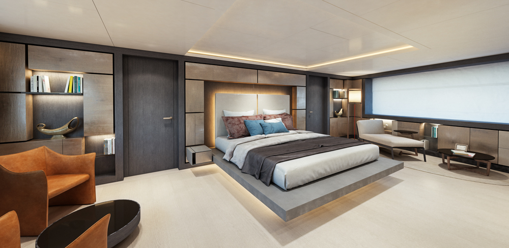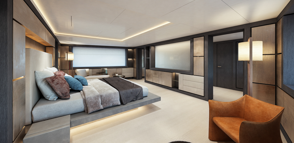 La master suite di 75 mq con ufficio privato è a prua sul ponte principale. L’ampia cabina armadio armatoriale è stata posizionata in modo da essere certi di eliminare ogni possibile rumore proveniente dalla cucina. Una suite VIP a dritta, di fronte alla cucina, può essere utilizzata anche come cabina per il personale o per i bambini. Il salone principale di 78 mq e la sala da pranzo, con porte laterali scorrevoli in vetro su entrambi i lati, si affacciano sul ponte di poppa aperto e sulle doppie scale che conducono al beach club.