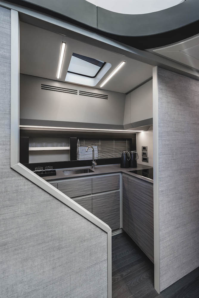 Sulla murata di sinistra si trova la cucina, strategicamente posizionata per accogliere diverse fonti di luce naturale, tra cui un’apertura sul cielino soprastante e un grande oblò apribile. A dritta la cabina ospiti, il cui bagno – con duplice ingresso, dalla cabina e dalla lobby del piano mezzanino – funge anche da day toilet.