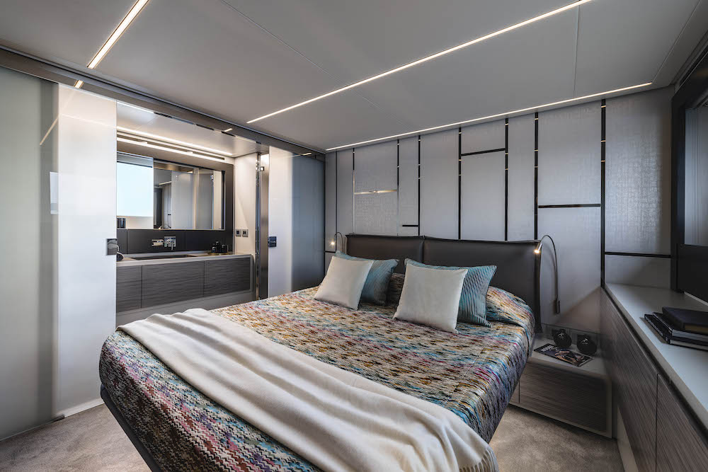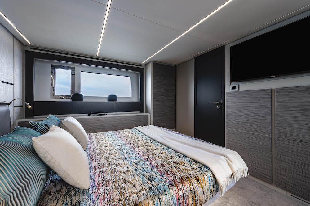 Scendendo alcuni gradini verso poppa si accede alla zona armatoriale, una suite a tutto baglio illuminata da una finestratura a scafo e da un oblò rettangolare posizionato verticalmente che regala una vista panoramica superlativa a pelo d’acqua. Lungo la murata di dritta c’è il bagno, diviso in tre ambienti e in grado di sfruttare l’intera larghezza della cabina, dalla quale è separato tramite due porte scorrevoli in bianco opaco. Anche in questo ambiente non manca l’attenzione ai dettagli, come lo spettacolare testaletto, caratterizzato da un’alternanza di pannelli di carta da parati Zimmer + Rhode Tide e inserti in metallo laminato. Cuscini in pelle Gruppo Mastrotto completano questo capolavoro di interior design, valorizzato da un’illuminazione a cielino con barre led orizzontali.