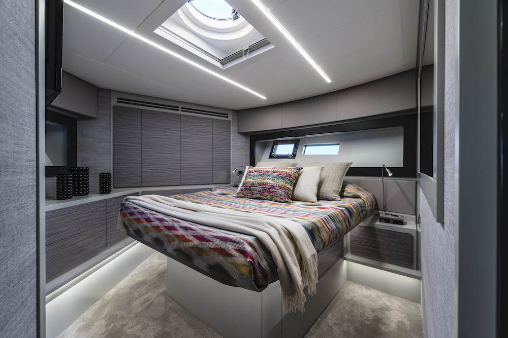 A sinistra della stazione di comando, una scala centrale permette di accedere al ponte inferiore con l’ausilio di un corrimano dal design originale, che si piega in modo organico per disegnare il parapetto posizionato dietro al divano. La prima unità di Pershing 6X prevede un layout a tre cabine – armatoriale, vip a prua e ospiti a dritta – e tre bagni con doccia separata. La versione per il mercato americano propone invece due cabine – armatoriale e vip – mentre quella per gli ospiti viene sostituita da un living.