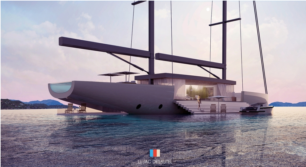 Queste due delle particolarità di Salt, così si chiama il progetto di un due alberi di 55 metri (armato con rande full-batten rettangolari, tipo quelle delle giunche cinesi) sviluppato dal designer Lujac Daseutel. Obiettivo di questo concept-yacht, realizzare il massimo dello spazio per gli ospiti a bordo. E in questo caso con i fianchi dello yacht che si aprono sul mare la larghezza massima di Salt, che ha un baglio di 11 metri, in pratica raddoppia arrivando a ben 21 metri.