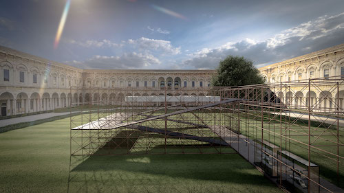 Al centro dello storico cortile centrale, un’alta impalcatura di tubi Innocenti gioca con i pieni e vuoti del colonnato, in un intreccio di linee rette che creano il percorso che ospita il visitatore. La struttura così concepita si ricollega alla natura industriale di Sanlorenzo e rimanda alle strutture che vengono effettivamente utilizzate per la costruzione delle imbarcazioni all’interno dei loro cantieri.