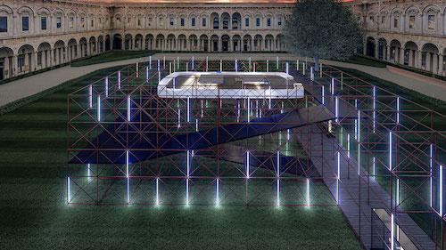 Al centro dello storico cortile centrale, un’alta impalcatura di tubi Innocenti gioca con i pieni e vuoti del colonnato, in un intreccio di linee rette che creano il percorso che ospita il visitatore. La struttura così concepita si ricollega alla natura industriale di Sanlorenzo e rimanda alle strutture che vengono effettivamente utilizzate per la costruzione delle imbarcazioni all’interno dei loro cantieri.