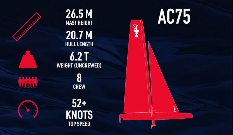 Pesi. L’AC75 pronto per la regata, compresi equipaggio e attrezzatura deve pesare tra 6.920 kg e 6.940 kg. L’equipaggio, vestito ed equipaggiato, deve pesare tra 712 e 740 kg. I pesi dell’equipaggio sono presi due giorni prima della prima regata di ogni evento e la pesatura non viene ripetuta durante l’evento.