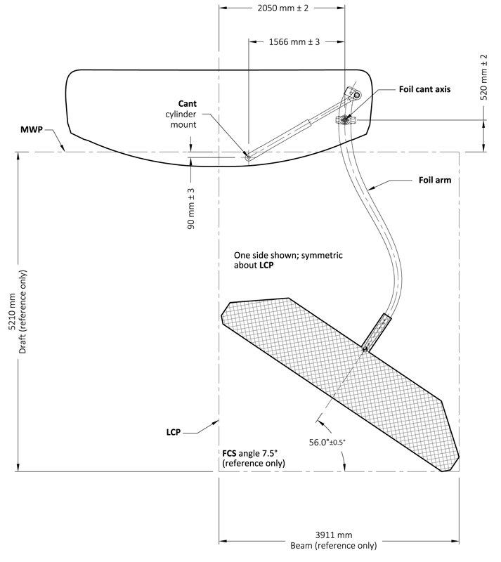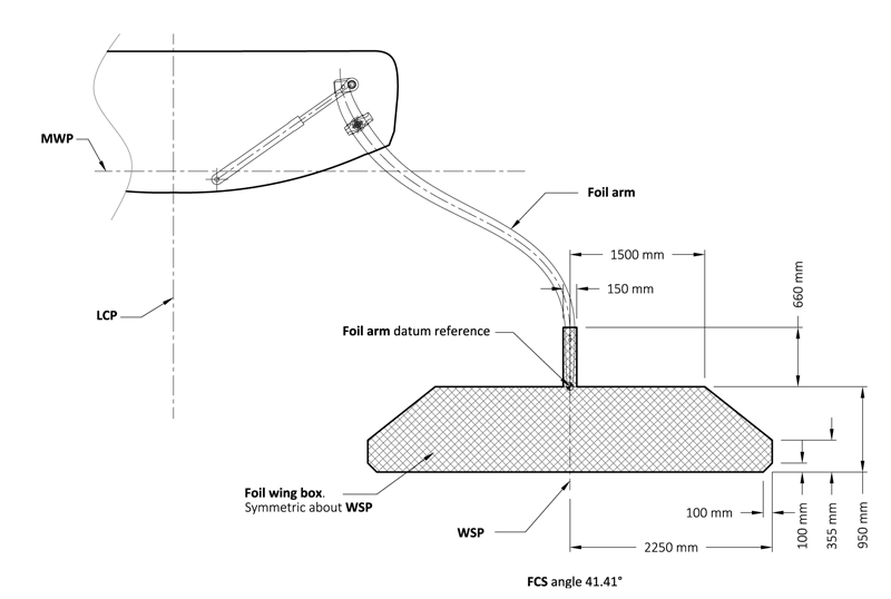 Foil. Ogni foil comprende arm, wing e flap deve essere posizionato tra due piani posti a 10,0 e 12,0 metri dallo specchio di poppa.