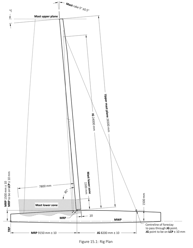Albero. Come nella 36a America’s Cup il “tubo” in fibra di carbonio e il sartiame è fornito dall’organizzazione. L’albero, dall’appoggio in coperta alla testa, arriva a 26,50 metri di altezza.