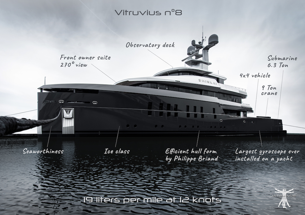 “Questo è un progetto speciale per noi, perché Shinkai è il secondo yacht che abbiamo progettato per lo stesso armatore. Infatti, è stato il primo velista ad abbracciare i vantaggi degli scafi efficienti di Vitruvio”, dice Philippe Briand. Il risultato è uno yacht a motore di 55m, 974GT con caratteristiche straordinarie