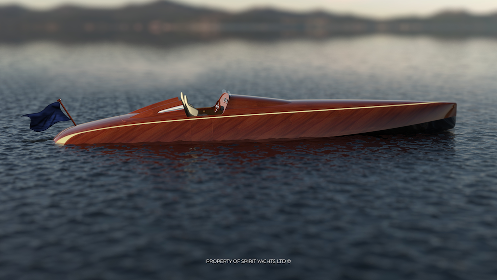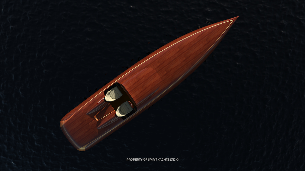 Il design pulito ed essenziale delle linee riporta alla memoria quelle che caratterizzavano le race boat degli anni 20. In questo caso specifico però il riferimento a un nome preciso: Baby Bootlegger. Progettato da George Crouche e costruito nel cantiere di Henry B. Nevins a New York questo runbaout in legno vinse nel 1924 e nel 1925 le mitica APBA Gold Cup di Detroit. Ma oltre a i meriti sportivi dal punto di vista tecnico Baby Bootlegger salì alla ribalta perché montava un motore otto cilindri a V della Hispano-Suiza, prodotto su licenza negli Stati Uniti dalla Wright-Martin, e assurto alle cronache per aver fatto volare nella Prima Guerra Mondiale molti celebri caccia militari, come lo SPAD S.XIII. Un legame quello con il volo, questa volta sull’acqua, che torna d’attualità con il progetto messo a punto da Spirit Yachts.