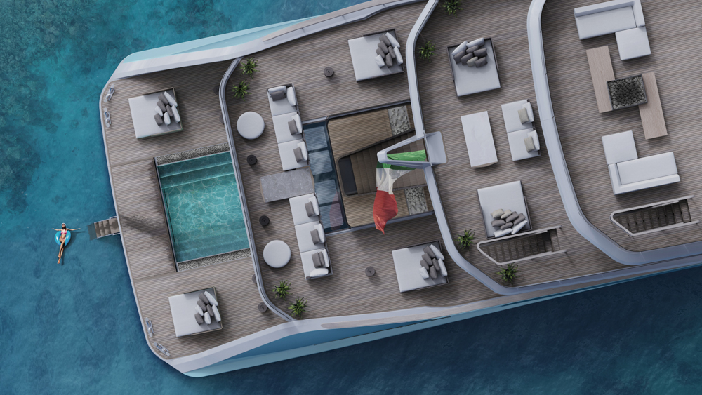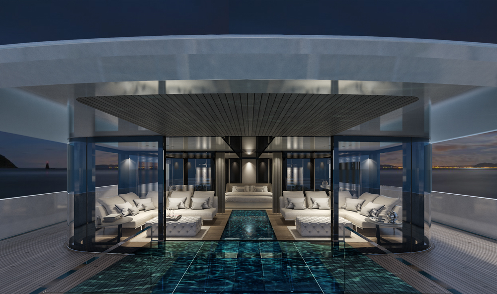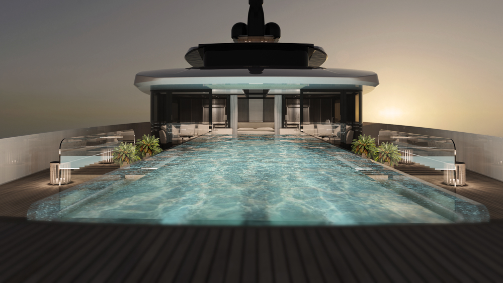 La sontuosa cabina armatoriale si trova a prua del ponte superiore, con accesso diretto a una “Flying Pool” dall’incredibile lunghezza di 9,5 metri. Questa piscina ha il fondo vetrato: una soluzione che non solo regala la sensazione di nuotare sospesi nello spazio, ma consente alla luce naturale di filtrare nella lounge semiaperta e nella palestra sul ponte sottostante. Una soluzione del ponte di prua mai tentata prima su un superyacht.