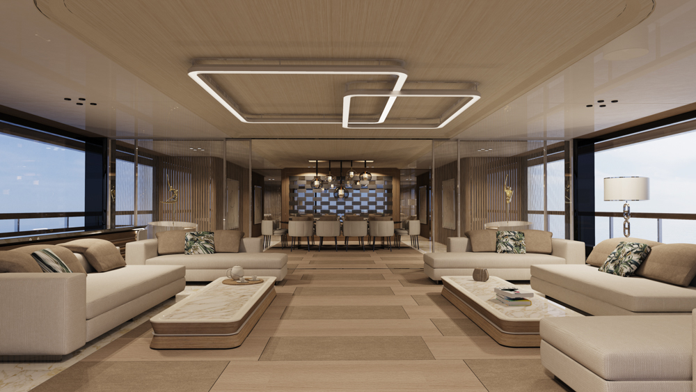 Con la sua lunghezza fuori tutto di 76 metri e il baglio massimo di 12,5, il progetto Apache in acciaio e alluminio si basa su una nuova piattaforma tecnica con uno stile esterno elegante, un design interno chic e caratteristiche di lusso mai viste prima firmate Alberto Mancini.