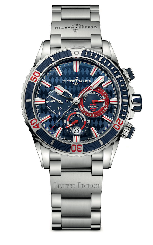 Now Ulysse Nardin pays homage to the most important date on the nautical calendar with a Limited Edition Diver Chronograph Monaco. Clothed in elegant red and blue, colours it shares with previous iterations of the Monaco, the Diver Chronograph commemorates the event with a minutes counter sporting the Principality of Monaco heraldic motif which is also featured on the watch’s sapphire caseback. The blue dial features the Monaco Yacht Show 2016 inscription while the indices and hands are in the colours of the Monaco flag. Ulysse Nardin’s deep-rooted connection with the sea is alluded to in every aspect of this collector’s timepiece of which just 100 steel versions will be made. An incredibly functional diver’s watch and precision chronograph in one, it will effortlessly tackle even the toughest ocean challenges, making it perfect for seafarers and sea-lovers alike.