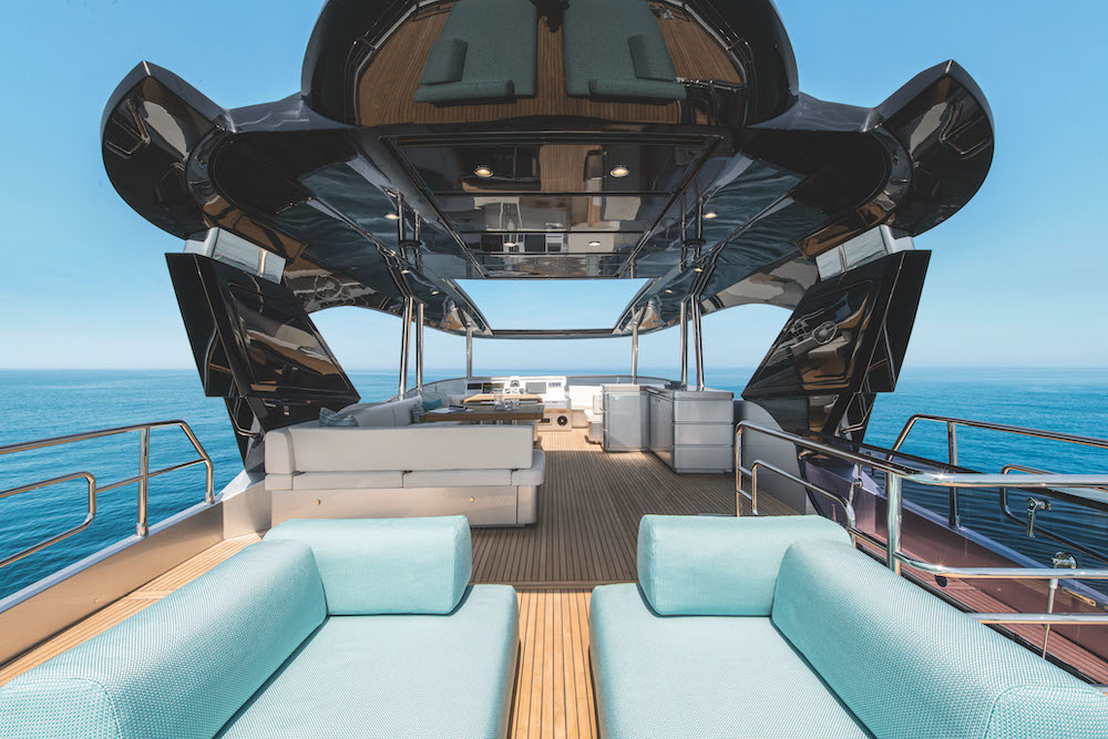 Furnished with sofas and occasional tables, it offers gorgeous sea views and is reached by side walkways that run into one another amidships ahead of the windscreen. A Monte Carlo Yachts signature.