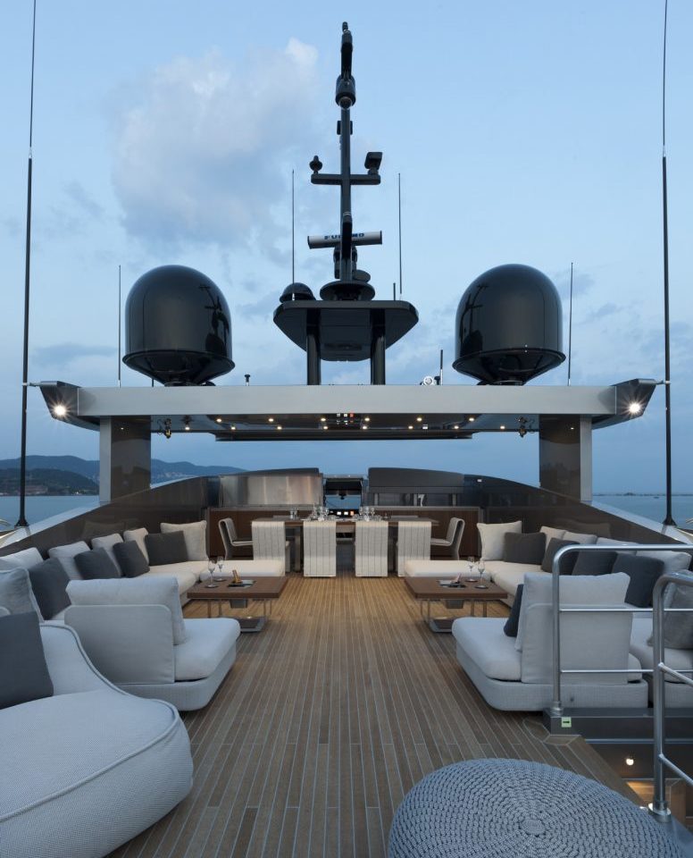 The atmosphere is comfortable and relaxing, similar to that found on large private jets, and is further enhanced by a skilful use of lighting, aimed at ‘softening’ the wood curves even more. Interior and outdoor furniture also deserve special mention: nearly all sofas, tables, lamps and handles have been entirely customised to fulfil the very precise wishes and requirements of the owner.