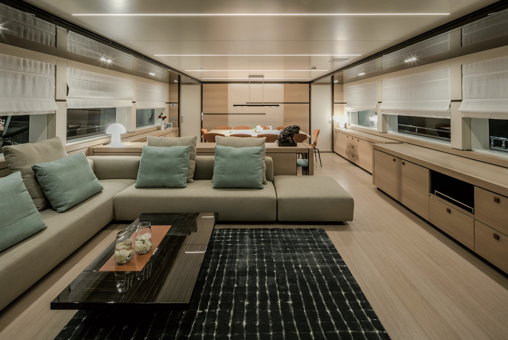The Flexform aesthetic also reappears in the upper deck sky lounge which opens on the aft terrace where the tender is located but does not interfere in the least with the al fresco dining area. “Offering the owner and his guests ample outdoor spaces was one of our priorities,” explains Mario Pedol, pointing out the large terrace with dining area, bar and relaxation zone on the sun deck. The latter flank the other terrace with its C-shaped sofa, table and sun pad forward of the bridge on the upper deck.