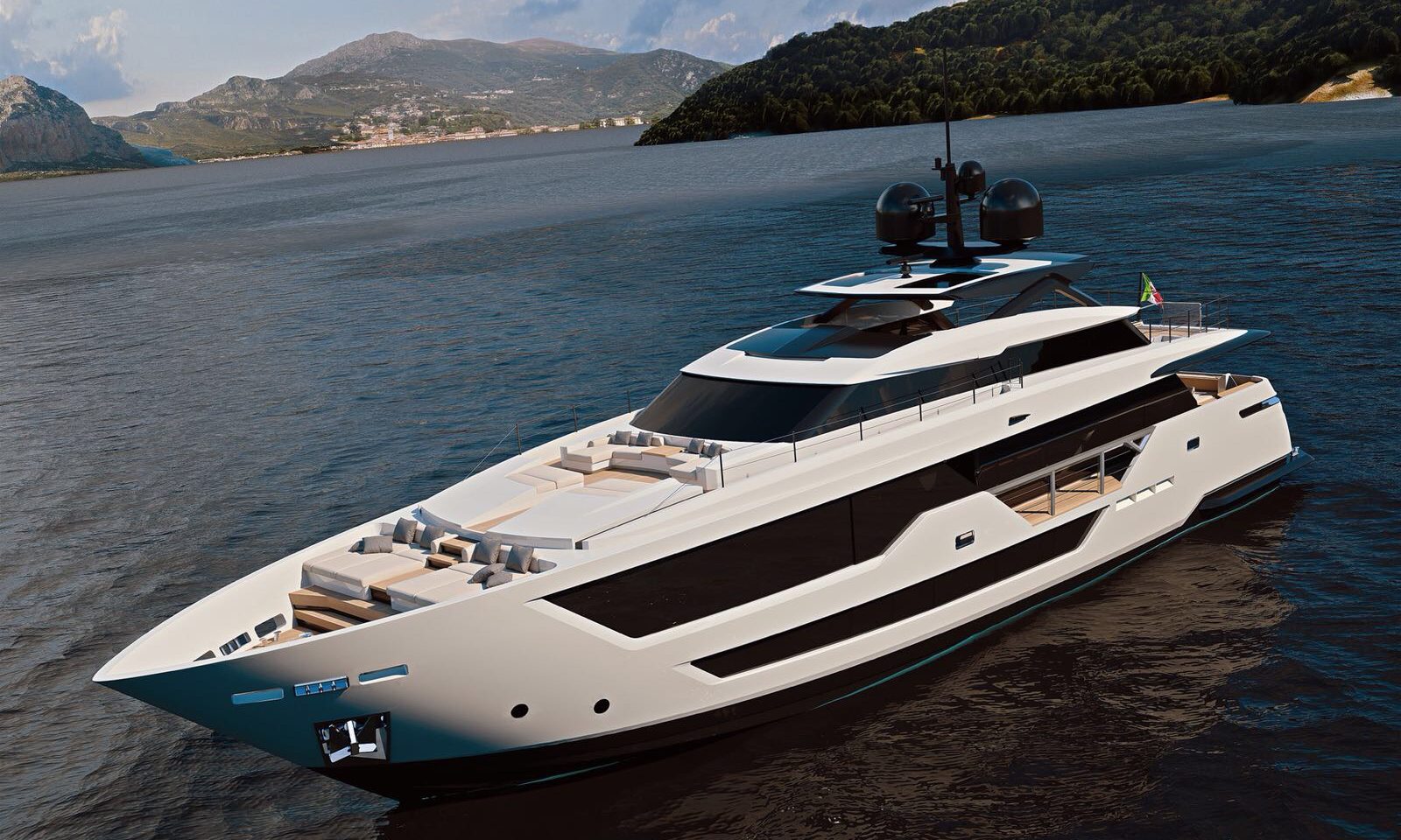 The new yacht has large floor surfaces (a total of 220 m2/2,370 square feet) that are all interconnected. To the stern is a more advanced version of the patented DMT – Dual Mode Transom system. It features two hatches that cover the stairs when the vessel is in motion, thus giving the stern an unbeatably clean-cut appearance. When the ship stops, they disappear into the central part of the door so that guests can climb up. From the garage, a tender of up to 5.45 metres and a three-person jet ski can be lowered into the water.