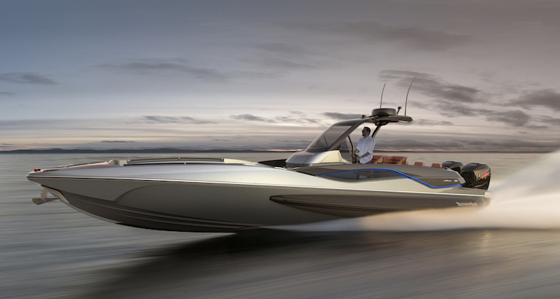 Drawing on the company’s racing heritage, the new high performance model will be capable of a leisurely 70mph (62kts) ‘out of the box’ with standard twin Mercury 400R outboards mated to Mercury Racing Digital Zero Effort throttles.