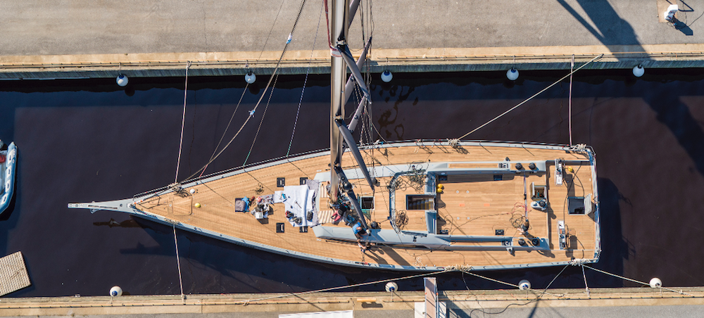 Haromi is fitted out with a bespoke performance package to upgrade her racing ability, reflecting her owner’s competitive success. This includes a longer bowsprit, ECsix carbon rigging, halyard locks, a square-top mainsail with running backstays, a mainsheet traveller and additional powered winches on the coachroof.