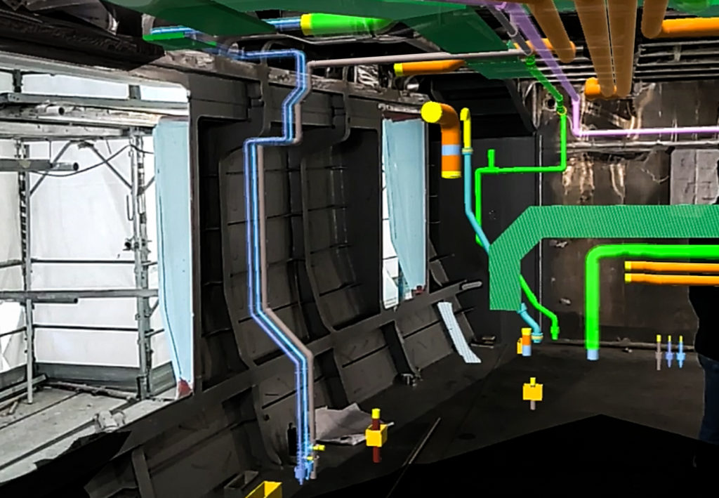 - Allows you to view, accurately locating, systems, installations (piping and cable roads) and structural elements behind the ship outfitting, in such a way as to make checks or refitting activities more efficient, avoiding unnecessary searches and dismantling.