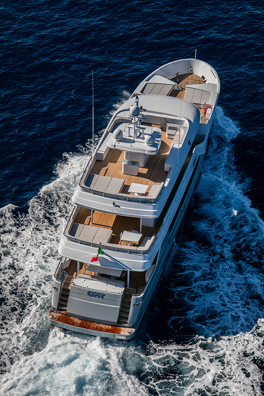 At the same time the yacht was also commended for her ability to reach a speed of 20 knots and cruise with a range of 2,000 miles at a cruising speed of 11 knots. The yard from Genoa has managed to unite efficient hydrodynamics with elegant lines, with special attention paid to performance, sea-kindliness, range and fuel efficiency.