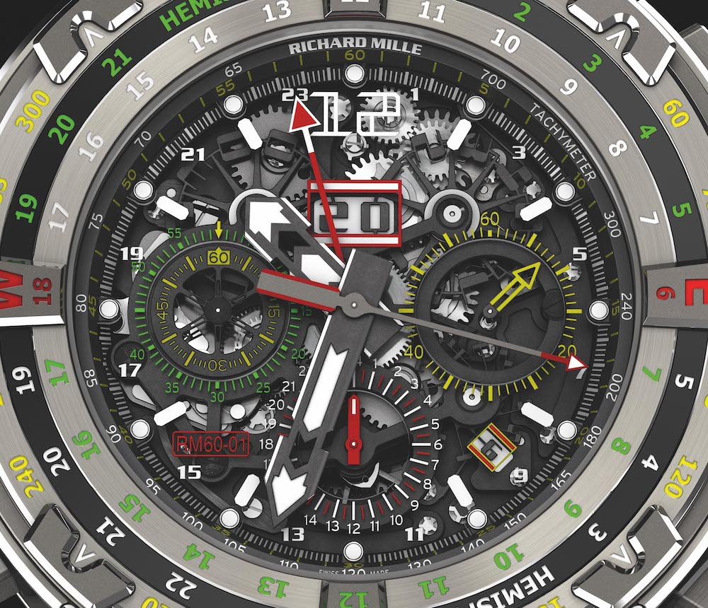 The rotating bezel shows the four points of the compass, the two scales, one graduated on 360° and the second with the 24 hours, so the RM60-01 is a valuable instrument for plotting course and location in open sea or during ocean races. This is achieved by starting from the local time and the position of the sun.