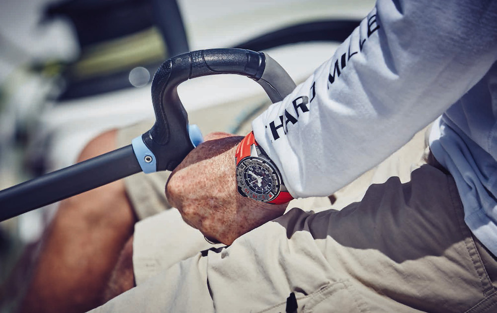 This role is beautifully expressed by the RM 60-01 Flyback Chronograph Regatta. It’s no ordinary watch, and celebrates Richard Mille’s watchmaking vision for the sport – in fact, it can be regarded as a true mechanical prodigy. The beating heart of this timepiece is the Calibre RMAC2, an automatic mechanical movement with variable inertia spring. Made in grade 5 titanium, it has a 50-hour power reserve and powers the flyback chronograph, second time zone and year calendar, with large date information in the double window at 12 o’clock and month data displayed between 4 and 5 o’clock.
