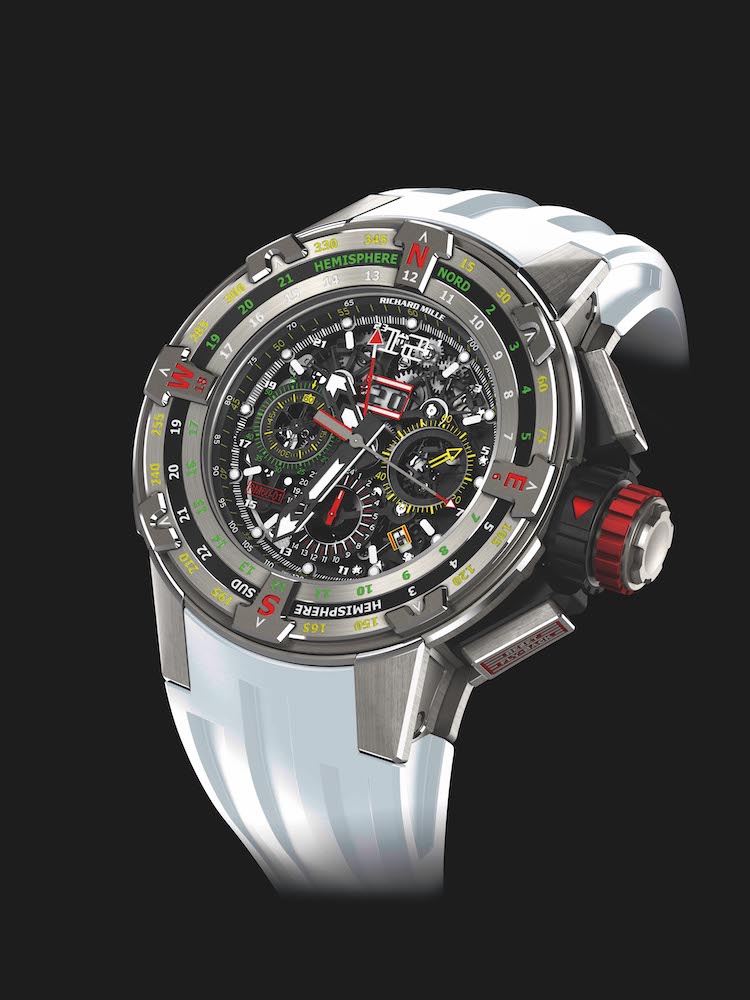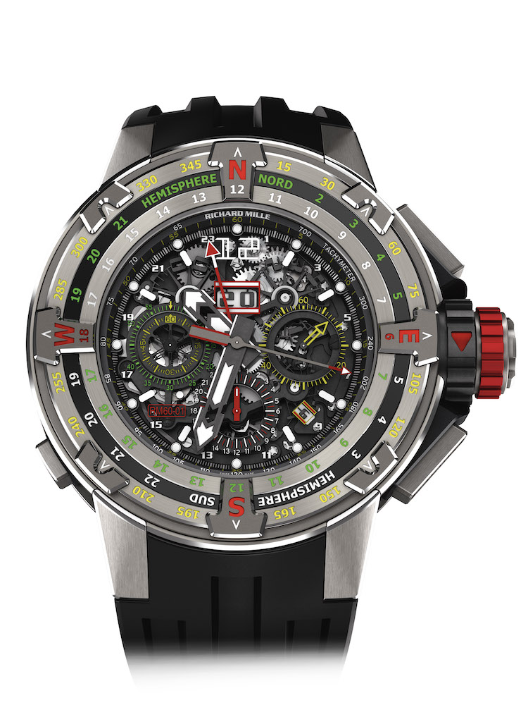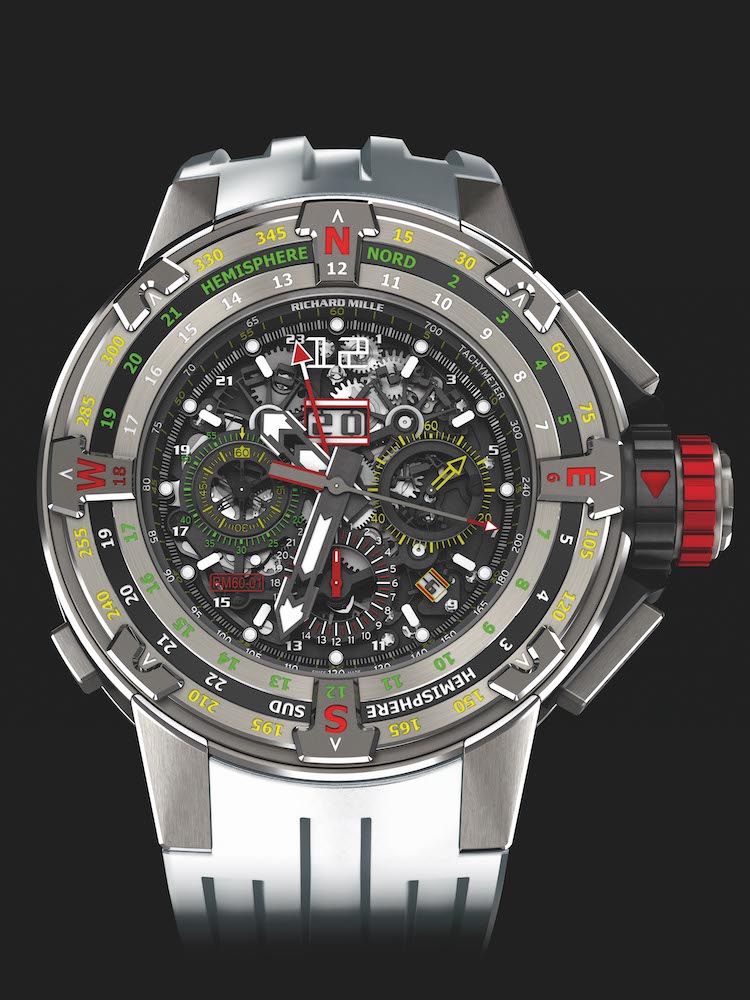 The rotating bezel shows the four points of the compass, the two scales, one graduated on 360° and the second with the 24 hours, so the RM60-01 is a valuable instrument for plotting course and location in open sea or during ocean races. This is achieved by starting from the local time and the position of the sun.