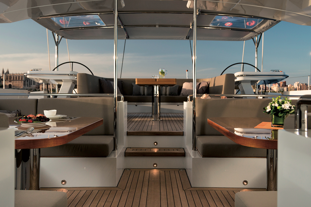That said, twin wheels located neatly in the central cockpit mean the main deck is completely uncluttered with plenty of room for guests to relax. This includes a beach area aft of the second cockpit which connects with the master suite. Two steps down from the rest of the sole, the beach area is a signature feature of Sea Eagle’s deck plan and it is also from here that guests move to the swim platform created by the open-down transom. The large central cockpit, on the other hand, is the perfect spot for enjoying the pleasures of life under sail or at anchor.