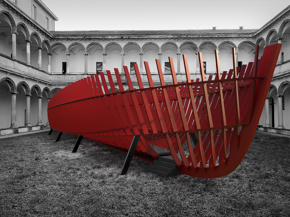 “As if the sea had run dry, the silhouette of a yacht has settled placidly inside a courtyard of the University of Milan, a creature whose only recognisable element is the structure defining its original purity.Piero Lissoni, Sanlorenzo’s Art Director