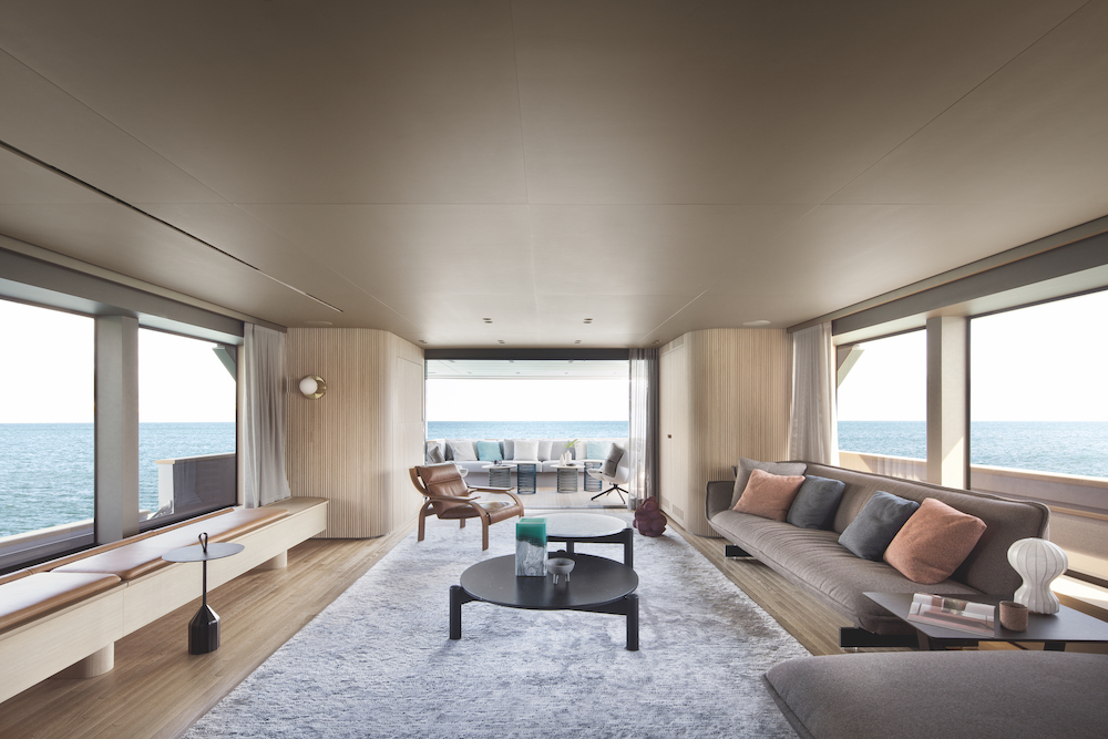 There is a sense of the sea everywhere aboard. “I very much wanted these visual references to the marine world,” Urquiola continues. “I wanted them to open to the outside world and so the furnishings had to follow suit. Starting with the wave-like ribbed wood panelling that guides us through the various rooms and creates an idea of reverberation as is the case with the entire colour palette sand to soft blue. Other subtle references include the headrest in the master staterooms which is inspired by the movement of the waves and the curtains and the stairs which reference lobster pots”, she concludes.