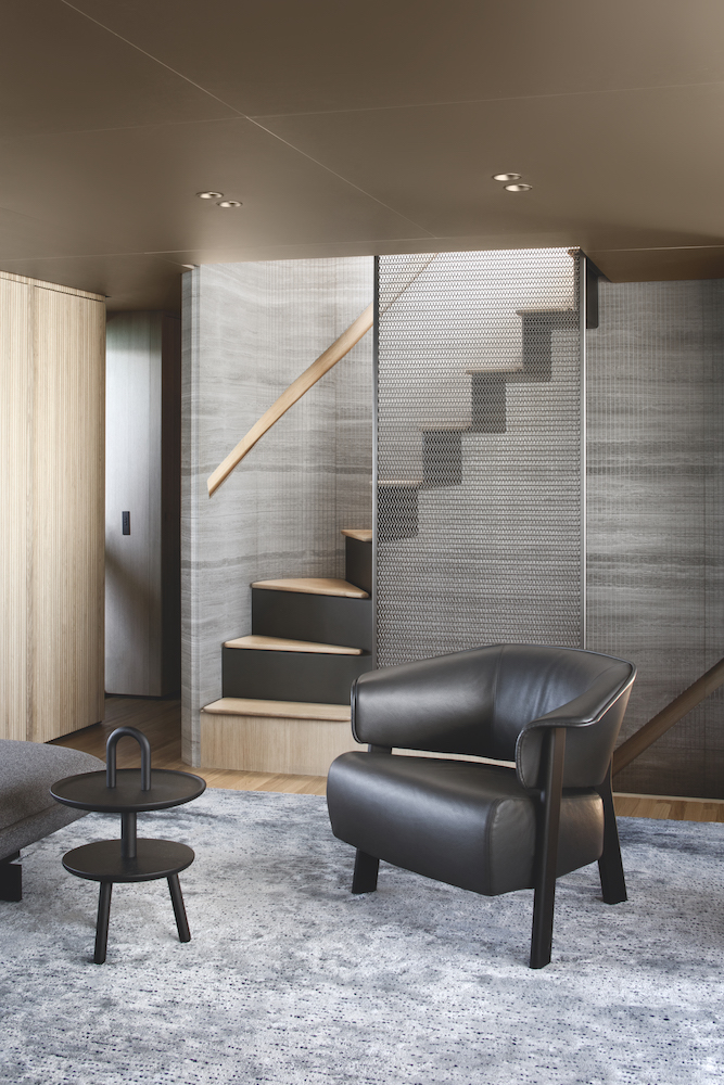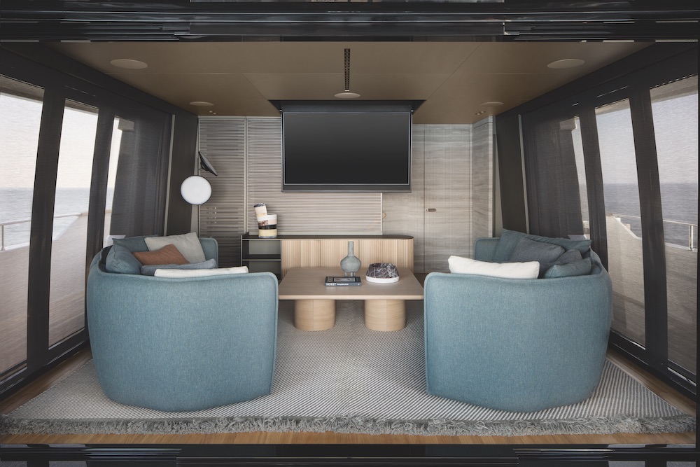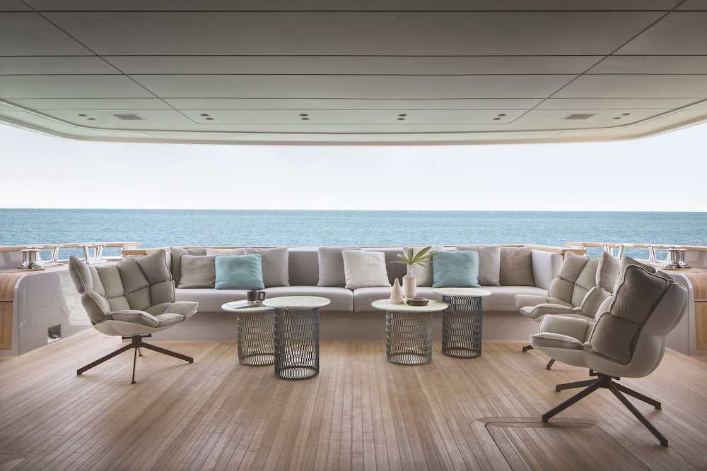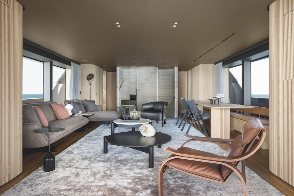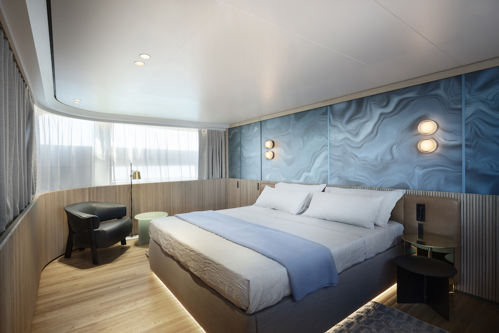 There is a sense of the sea everywhere aboard. “I very much wanted these visual references to the marine world,” Urquiola continues. “I wanted them to open to the outside world and so the furnishings had to follow suit. Starting with the wave-like ribbed wood panelling that guides us through the various rooms and creates an idea of reverberation as is the case with the entire colour palette sand to soft blue. Other subtle references include the headrest in the master staterooms which is inspired by the movement of the waves and the curtains and the stairs which reference lobster pots”, she concludes.