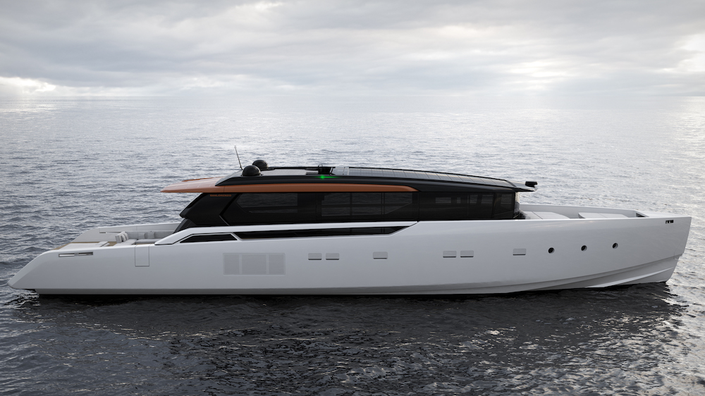 The design of the deckhouse was specially studied for the application of the solar panels in order to obtain the largest usable surface without disturbing the aesthetics of the boat’s profile. With a view to keeping the lines as homogenous as possible, there is a retractable anchor and the stern davit for launching tenders and other watertoys is also retractable.