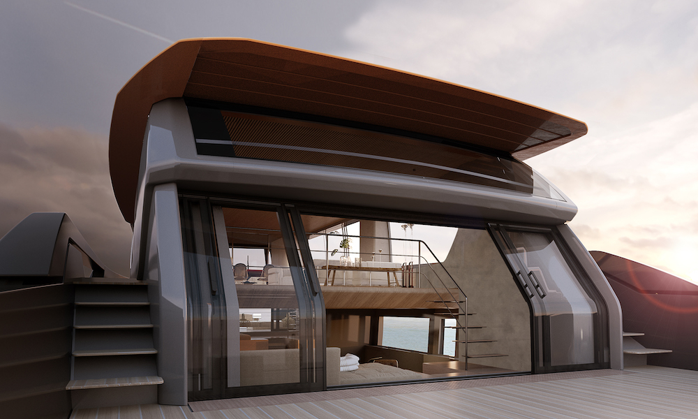 The design of the deckhouse was specially studied for the application of the solar panels in order to obtain the largest usable surface without disturbing the aesthetics of the boat’s profile. With a view to keeping the lines as homogenous as possible, there is a retractable anchor and the stern davit for launching tenders and other watertoys is also retractable.