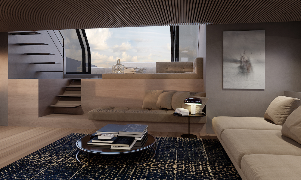 Equipped with a lounge area for flexible use, it adapts to different moments of conviviality and sociability on board. Under the flooring it is possible to place a tender that disappears completely from view allowing a total use of the spaces up to sea level. Below the flooring it is possible to place a tender that disappears completely from view, allowing total enjoyment of the space down to sea level.