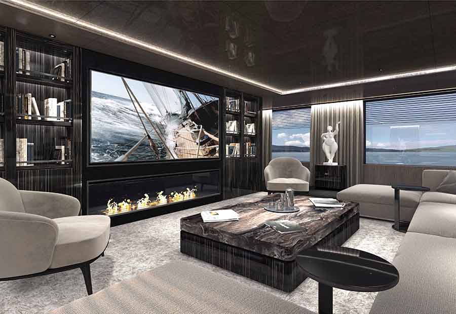 Forward of the winter garden and reception desk/bar, the main deck houses a cinema lounge/library that can be enclosed by an electric sliding glass panel, the dining room with its table for 16, and a stabilized fish tank. The cut-down bulwarks with laminated glass panels allow for sea views while having dinner.