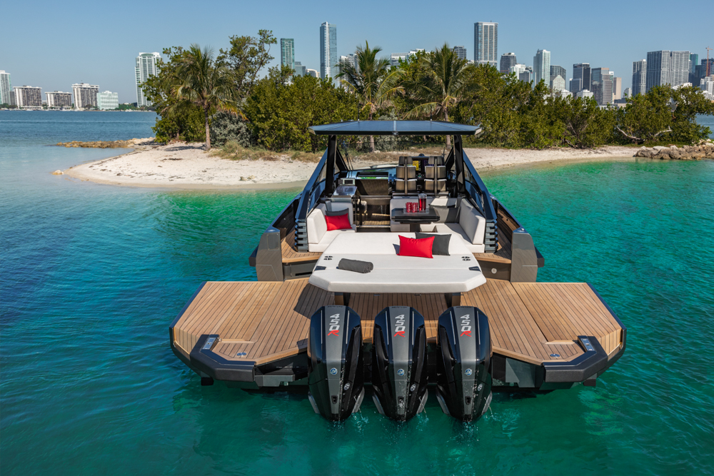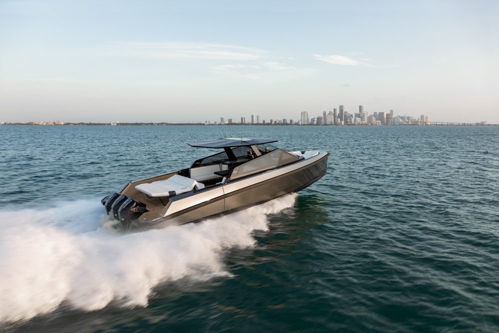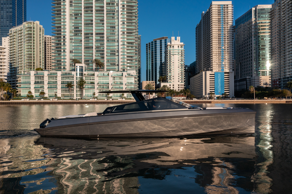 The inboard version of the yacht – the 43wallytender – was recently launched in 2020, debuting Wally’s innovative “center cockpit” design that offers the protection of a cockpit alongside the practicality and access of a walkaround, as well as a modular deck configuration that can adapt to an owner’s needs. The design combines the feeling of freedom in the open air and the security and comfort of a more enclosed yacht. And now, on the outboard version of the 13-meter yacht, owners can achieve even faster speeds and sportier performance while experiencing brand’s distinguished design pedigree. The 43wallytender X made its American debut at Palm Beach International Boat Show 2021, with the first unit being finished in Wally’s exclusive dark grey hue. The European premiere will take place at the upcoming Venice Boat Show (May 29 – June 6) where the stunning dark grey hue hull will turn heads once again.
