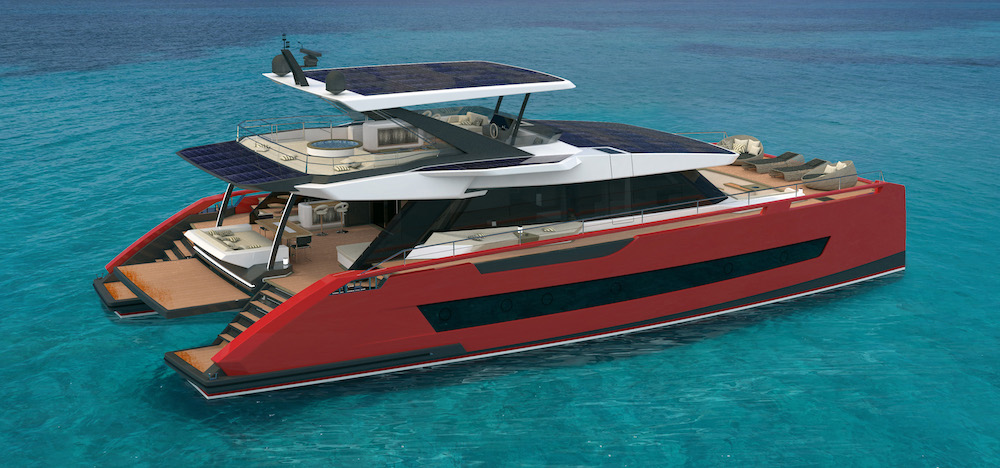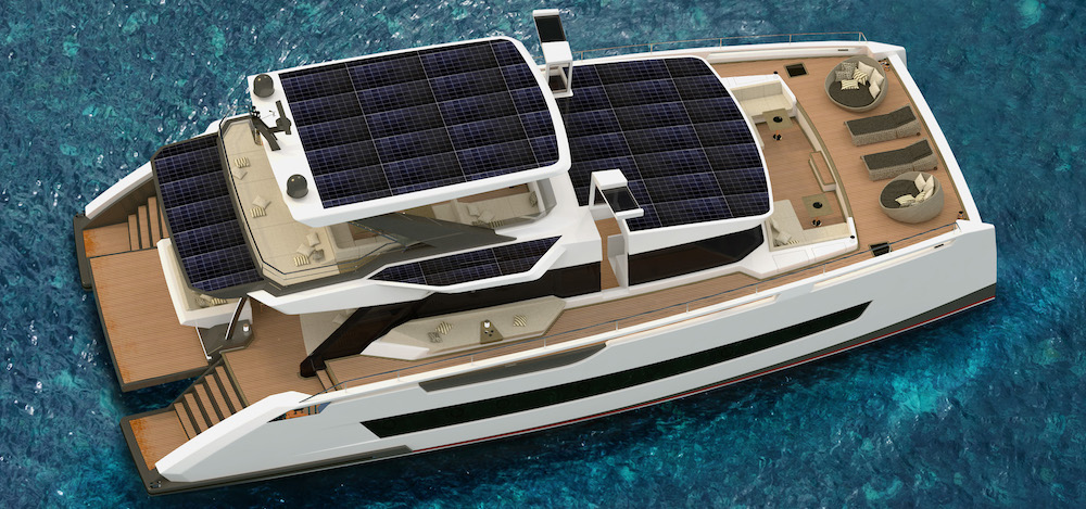 The Catamaran uses a hybrid propulsion system also powered by a 90 square meters high efficiency solar panels area.