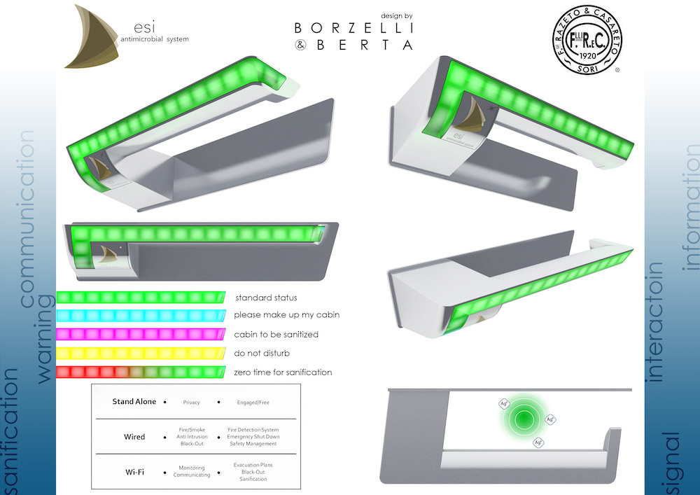With a design directly inspired by the catamaran angular shape, this “Smart” handle guarantees the possibility of interaction and communication with guests and crew, through its connection system (stand alone, wired or wi-fi) and the LED light interface. Most important, It also ensures that its surfaces cannot be contaminated by direct contact thanks to the use of ESI material, an emitter of silver ions (Ag +) and other metal ions. Through the emission of ions ESI exerts an antimicrobial action on objects and in the environment in which it is located, continuously sanitizing 24/7 in total safety.