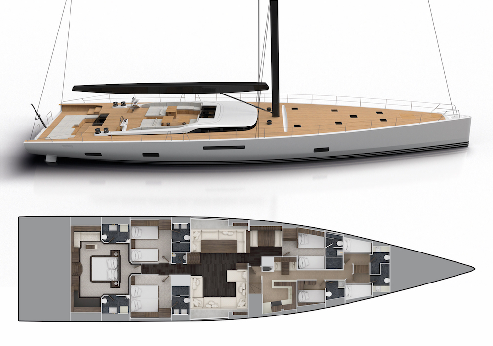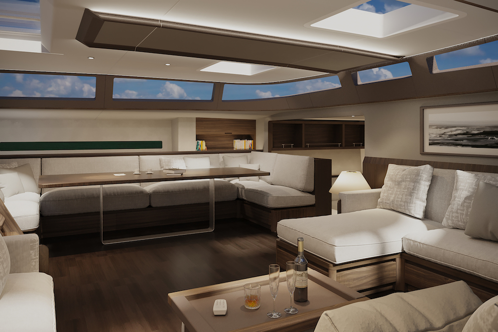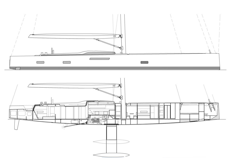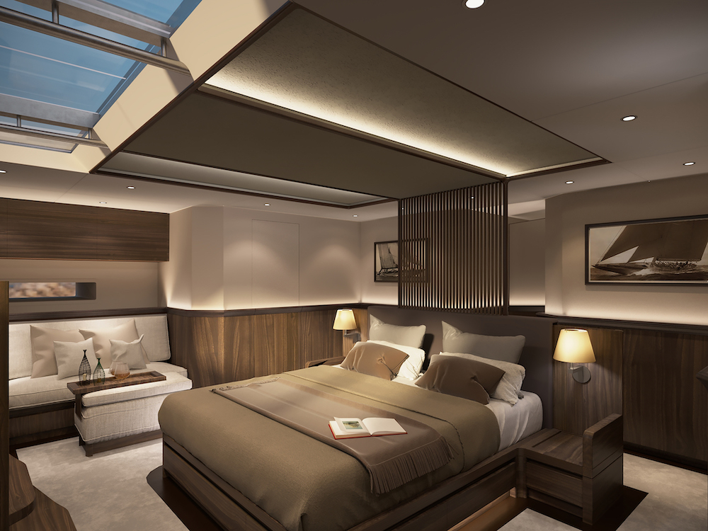 “Normally in Raised Saloon boats with the engine room under the saloon, the deckhouse is very obvious and bulky. But we worked very hard with Soto and MYT and feel that we have solved that issue with this new design”. Different materials are used in the various spaces: Canaletto walnut, fabrics, Alcantara. We used design cleverly organised spaces, finishes and wood grains to demonstrate that a sailing superyacht can be just as sophisticated and comfortable as a motor one”.