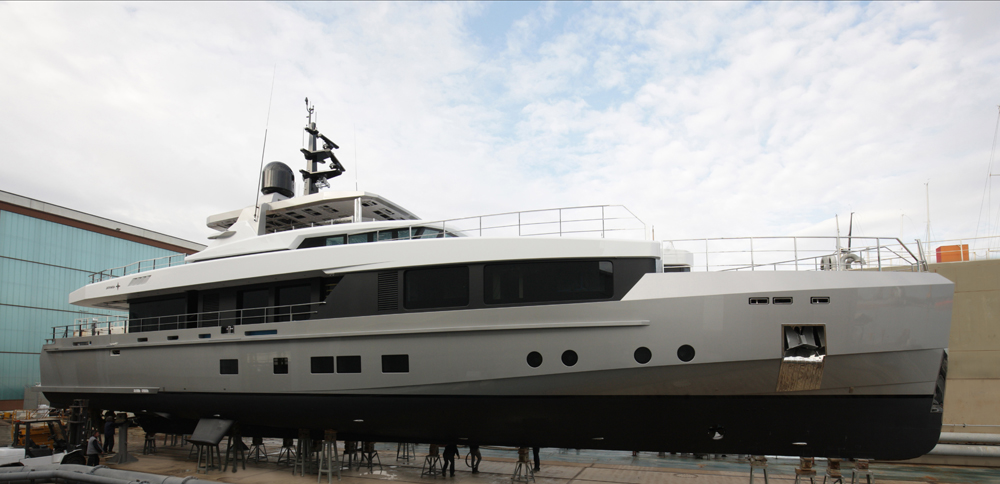 This time the spotlight was on M/Y ‘Tremenda’ 38 meter (124 ft), the third superyacht built of the successful “Impero” series after ‘Cacos V’ delivered in 2013 and ‘NONO’ in 2014. She follows the launches of the superyachts “Quinta Essentia” 55m (180 ft) and “Ouranos” 50m (164 ft) making 3 Admiral superyachts launched in a month! Tremenda is a hedgy, masculine and modern looking superyacht, with generous interior and exterior volumes; as each yacht of the Impero series, she features exterior design by Luca Dini and interior by Gian Marco Campanino and the Admiral Centro Stile. Entirely built in aluminium, she reaches a top speed of over 20 knots.