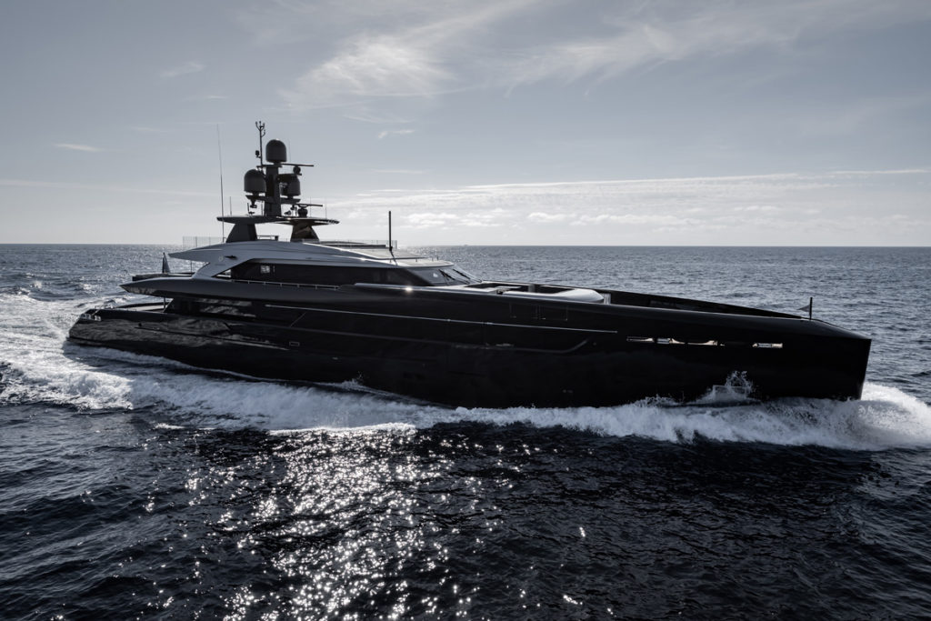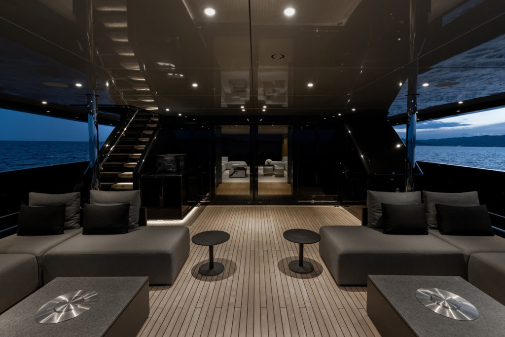 Another example of client customization is the elegant black hull and metallic grey superstructure. Dark hulls easily overheat in the sunshine, so to meet the owner’s request and achieve optimal results Tankoa specified special Awlgrip coatings that reduce the temperature of the metal hull by as much as 10°C.